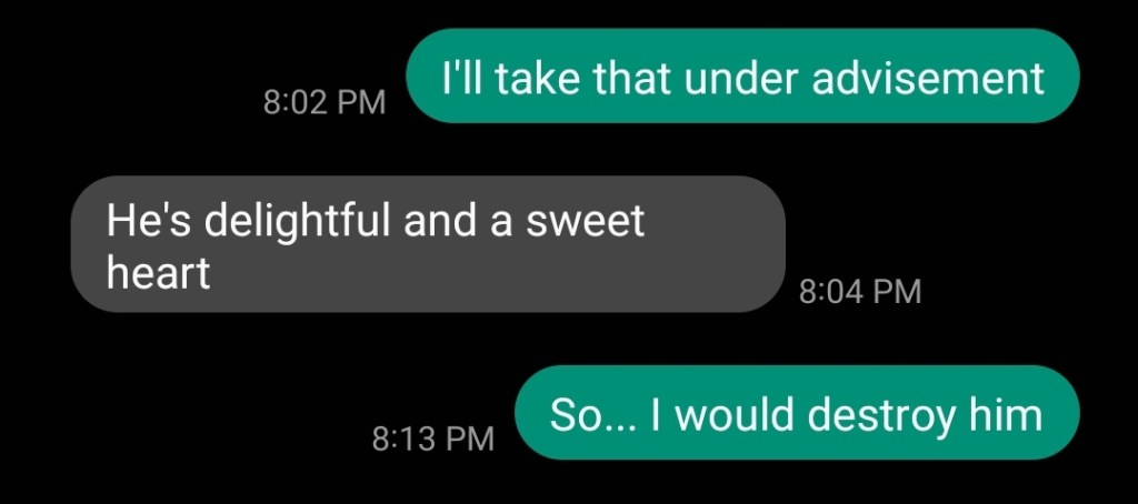 Before you judge the 2-hour gap in my response, please note that I was at the movies and I didn’t see the message until I left. I had to Google the show to see who she was talking about. I agreed, he was handsome but I knew nothing more.